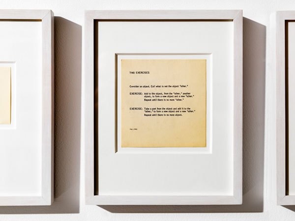 Works Exhibited 0037 ◄ Back Next ► Picture 15 of 20 George Brecht Event Scores, circa 1960’s Blank ink type printed on white cardstock Design: George Maciunas 10.75” x 8.75” framed