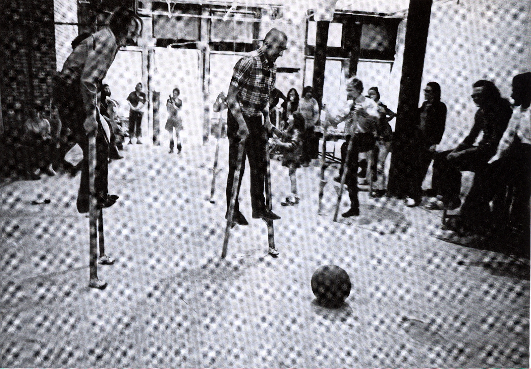 Art Forum: Fluxus Focus Fluxus Focus: Photographs by Peter Moore Hyperactive Activities ◄ Back Next ► Picture 13 of 19 Left to right: on stilts, Jonas Mekas, George Maciunas, and Adolfas Mekas playing Bici (Forbes) Hendrick's and George Maciunas'.
